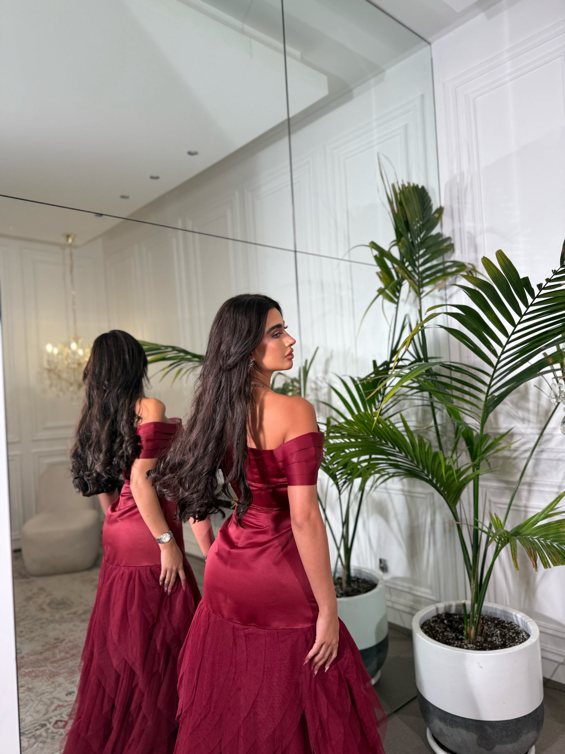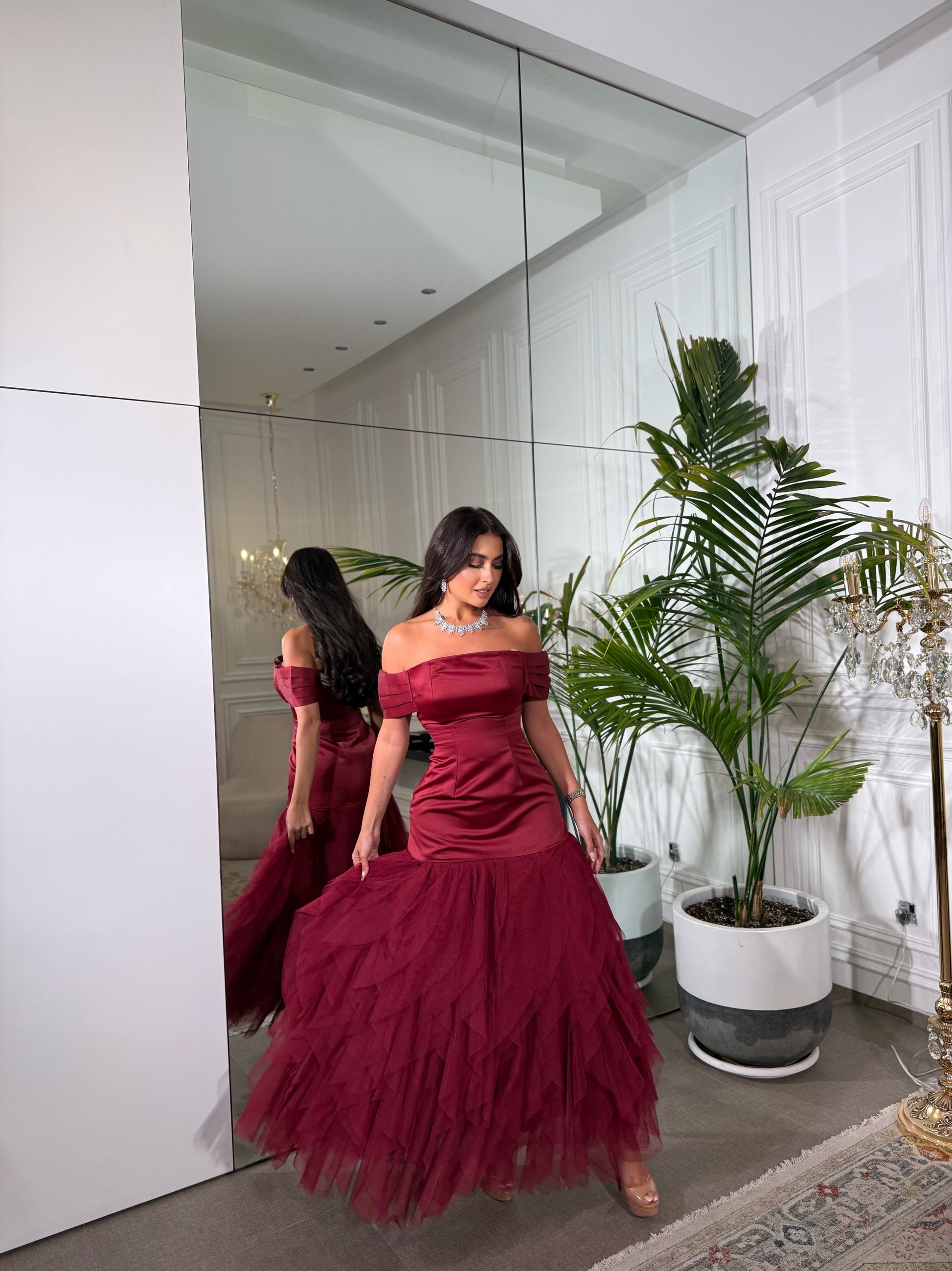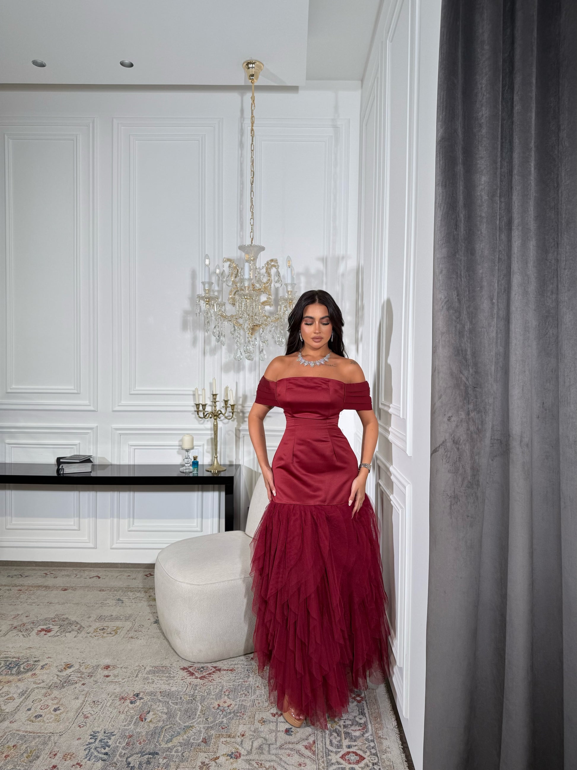 Off-shoulder satin gown with a fitted bodice and layered tulle skirt for a dramatic finish. Model is wearing size Small. Standard maxi length: 60 inches.