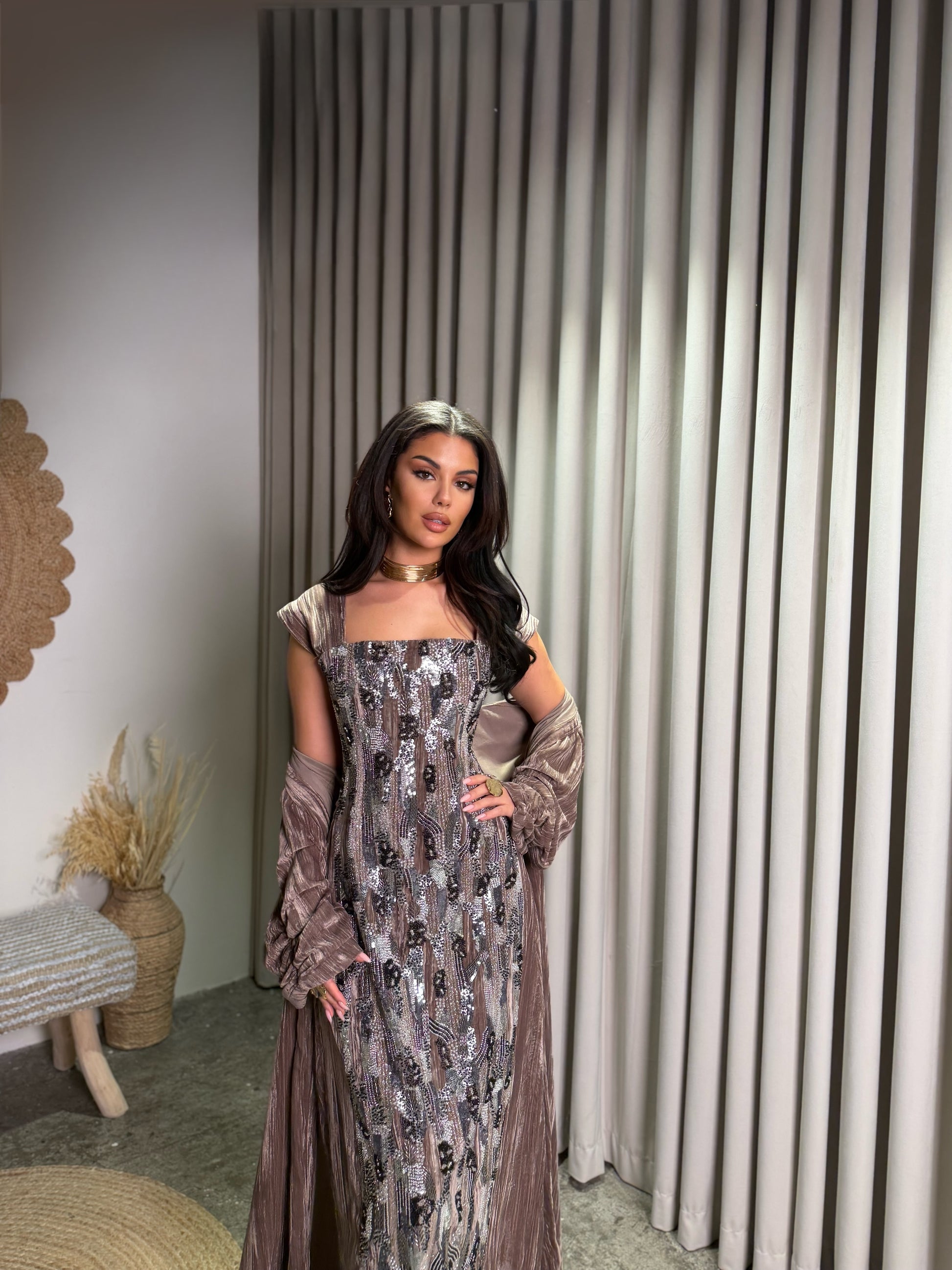 A two-piece evening daraa featuring a shimmering sequin inner gown paired with a flowing outer bisht. Designed for a refined, elegant silhouette with effortless movement.